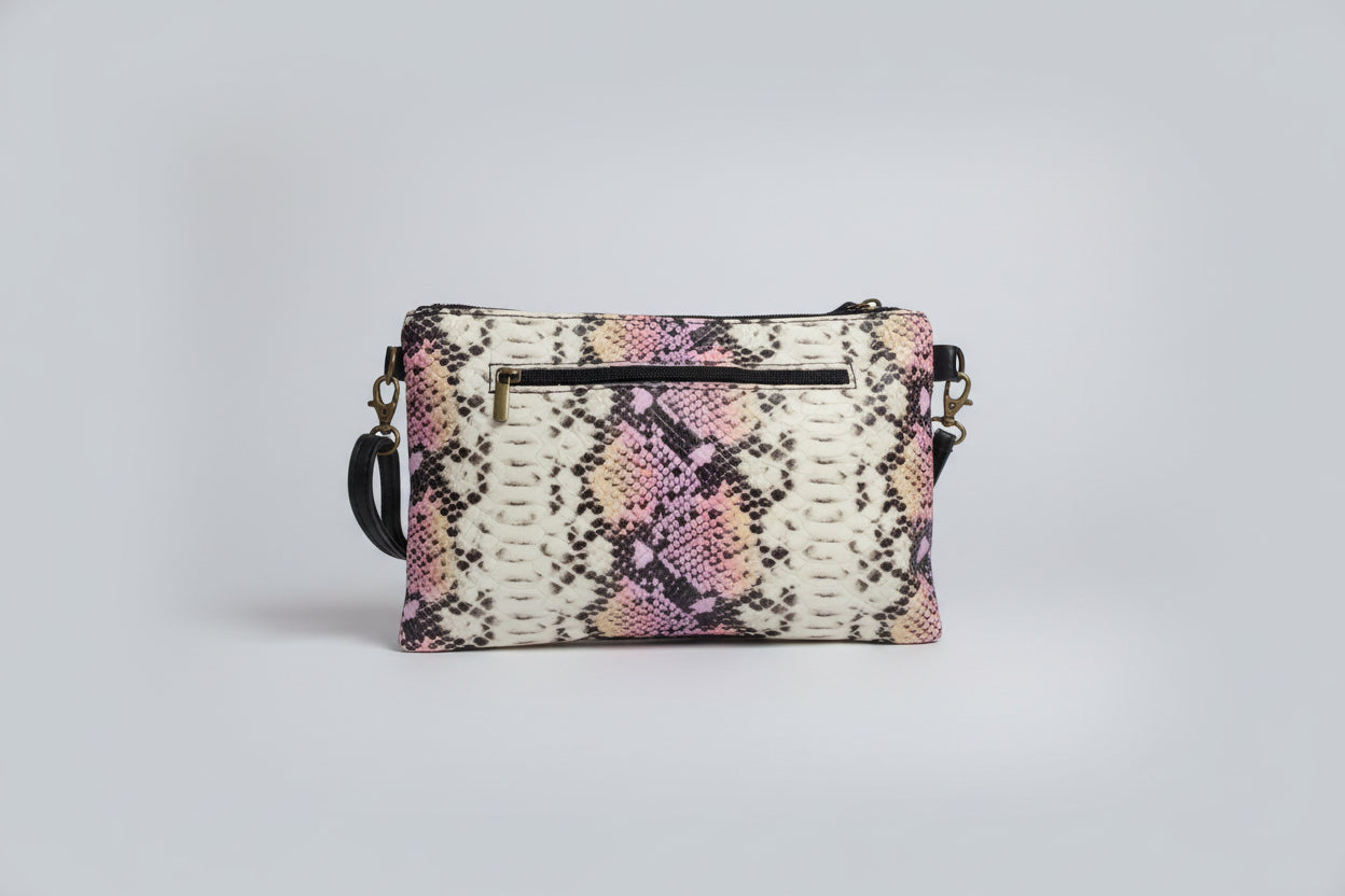 This stylish leather bag features a striking snakeskin pattern in shades of pink, beige, and black, adding a touch of elegance and sophistication. Crafted from high-quality leather, it offers durability and a luxurious feel. It comes with a convenient adjustable strap for versatile carrying options, whether over the shoulder or as a clutch. The spacious interior provides ample room for your essentials, while the secure zipper closure ensures everything stays protected. A fashionable and functional accessory to elevate any wardrobe.