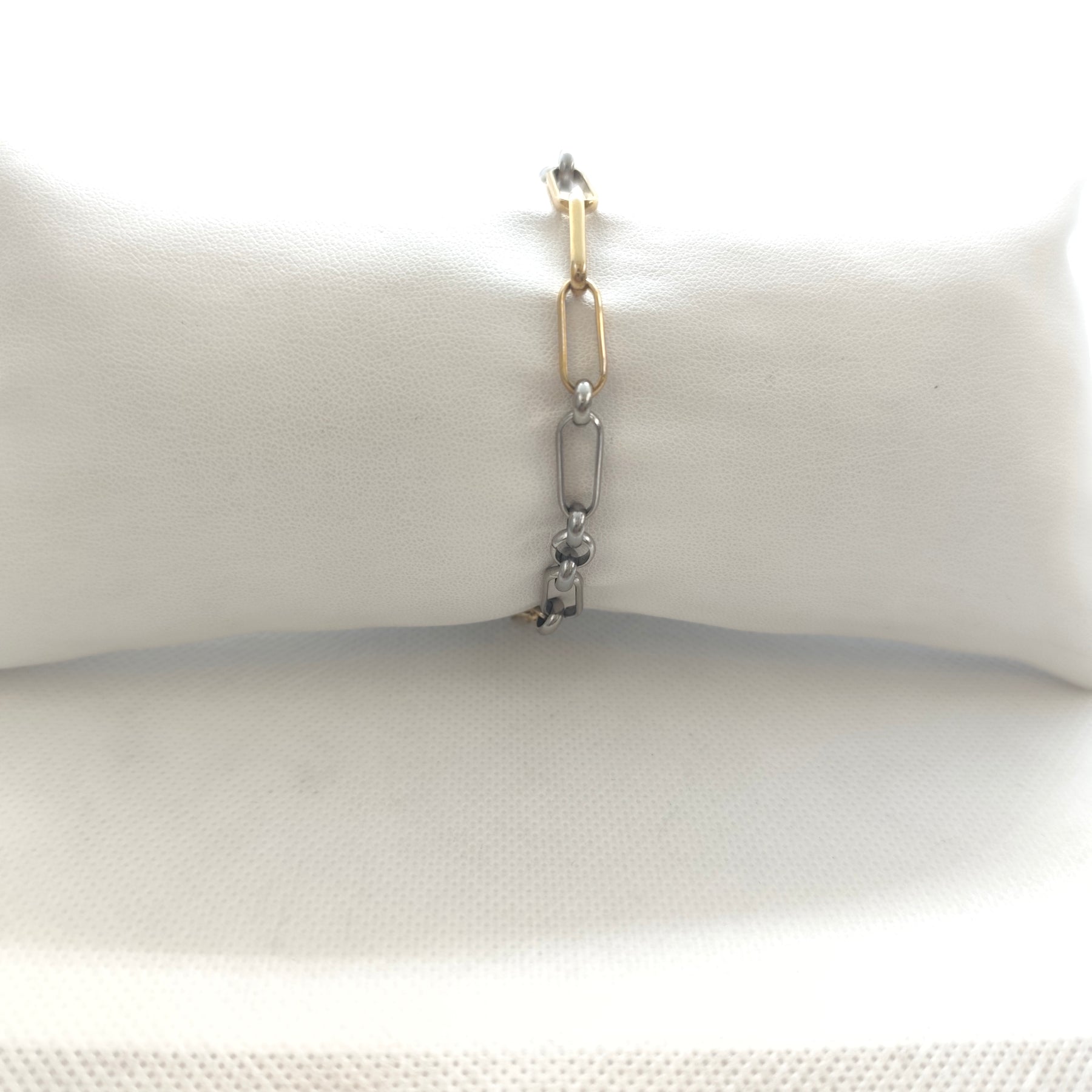 This bracelet features a stylish combination of gold and silver-tone elongated rectangular links, creating a modern and sophisticated look. The alternating colors add visual interest, making it versatile and suitable for various outfits and occasions.