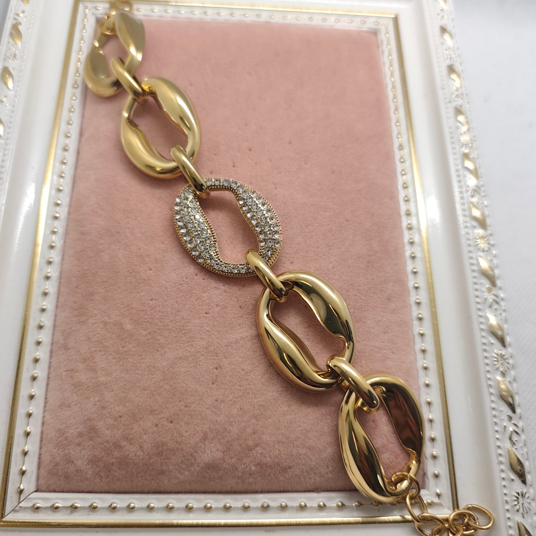 This stunning bracelet features large, polished links that are bold and modern in design. The centerpiece is an oval-shaped charm encrusted with sparkling stones, adding a touch of elegance and glamour to the overall look. The combination of chunky links and the shimmering embellishment makes it a fashionable statement piece suitable for various styles.