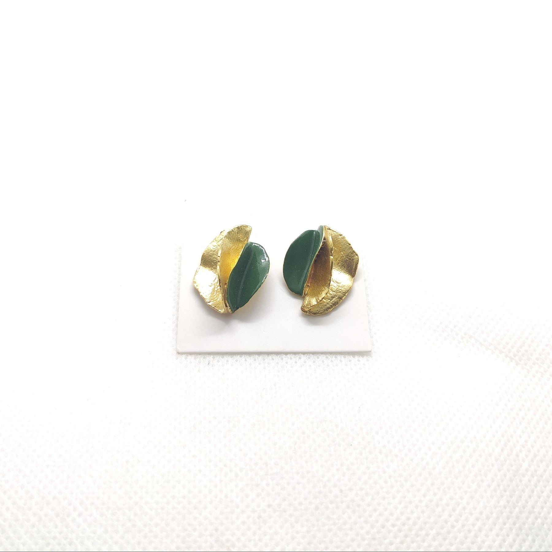 These are stylish earrings featuring a modern, abstract design. Each earring combines a matte dark green curved element with a textured, shiny gold-toned piece that creates a contrasting yet harmonious look. The earrings have an elegant and contemporary aesthetic, perfect for adding a touch of sophistication to any outfit.