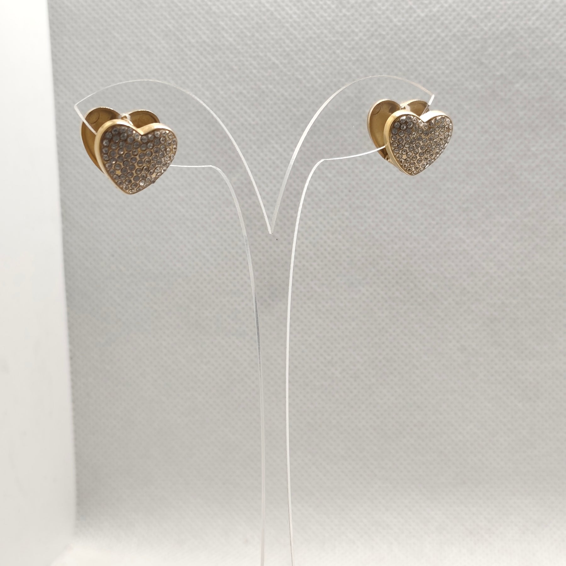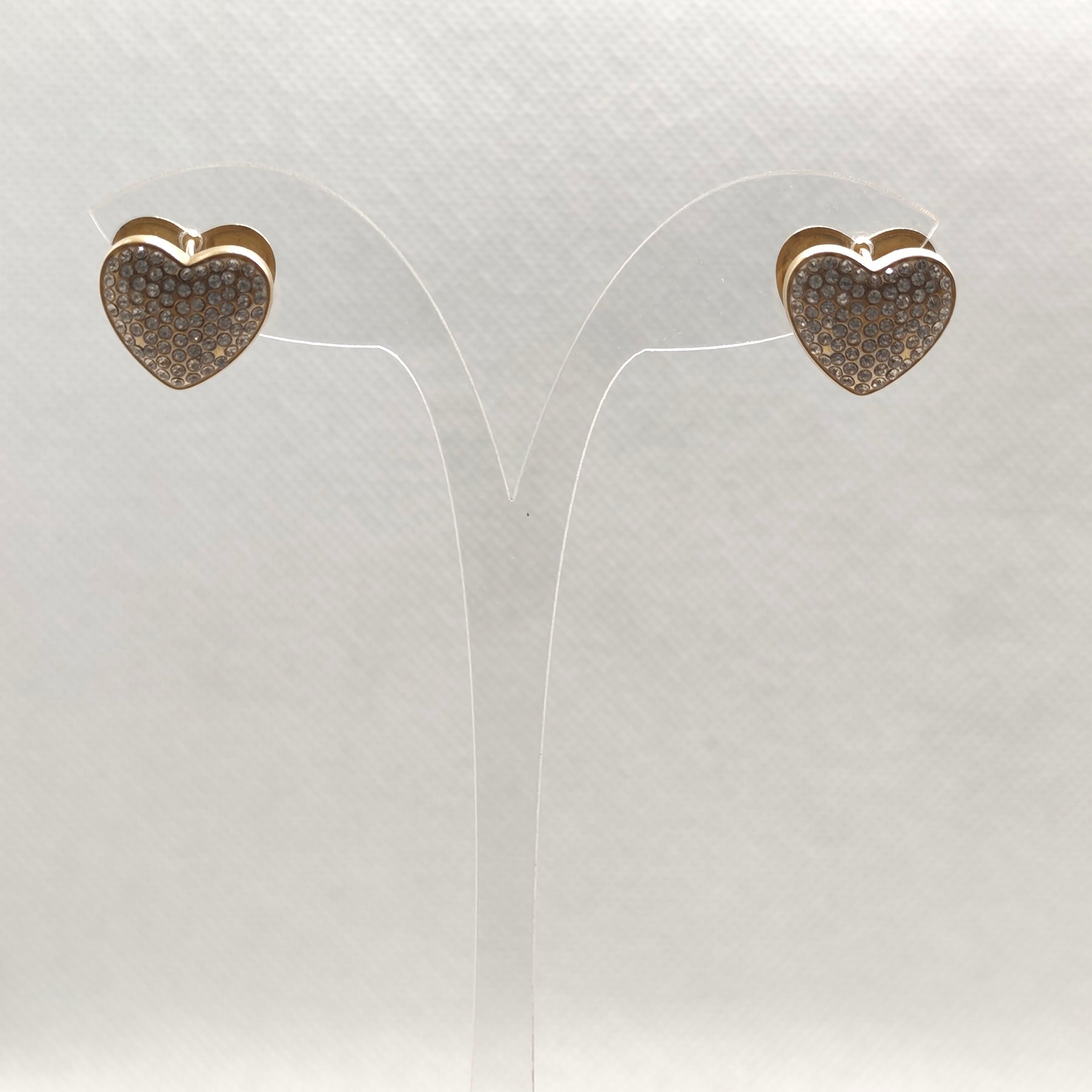 These elegant stud earrings feature a gold-tone heart shape encrusted with sparkling rhinestones. The design is compact and charming, perfect for adding a touch of glamour and romance to any outfit.