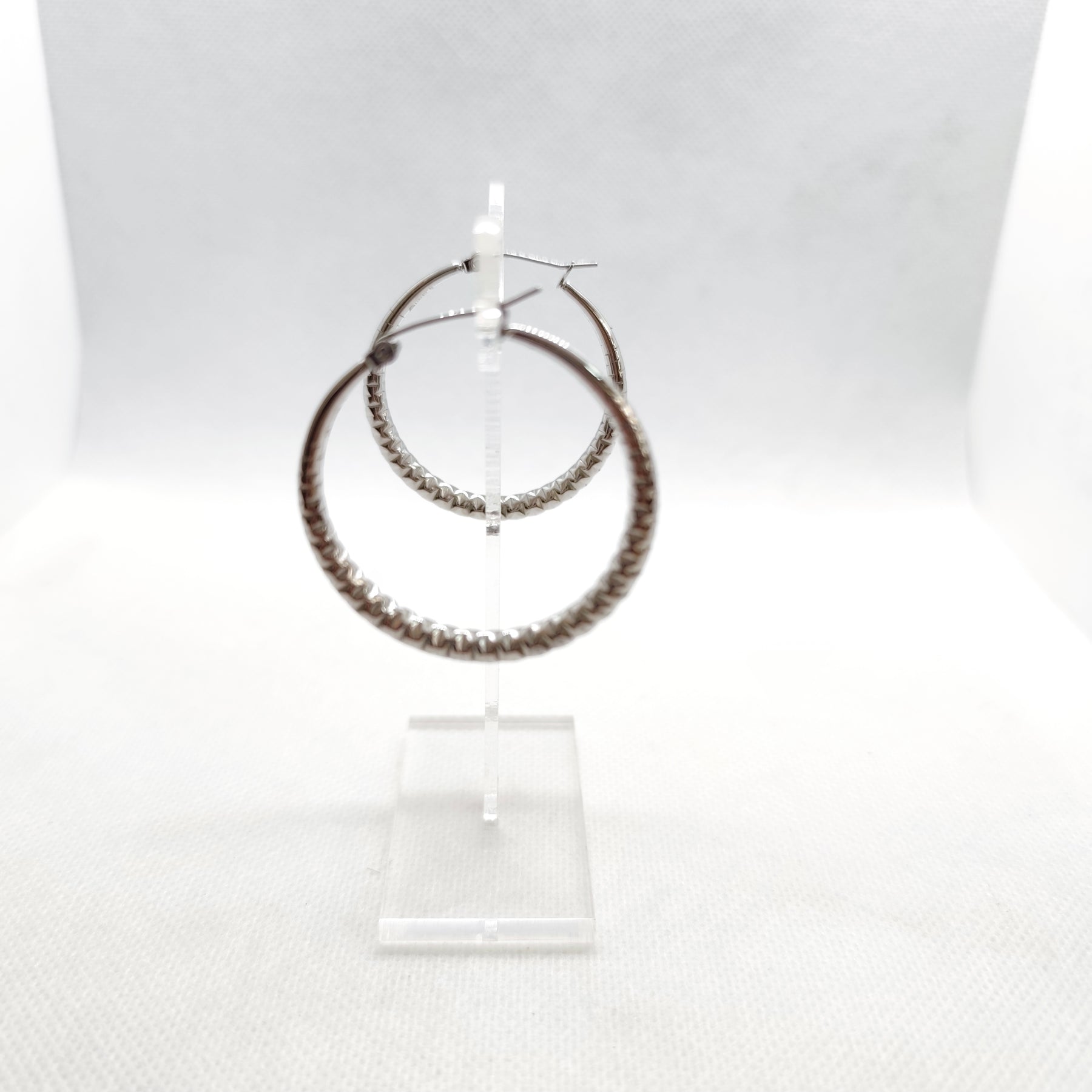 Add a touch of elegance and edge to your look with these stunning textured hoop earrings. Featuring a classic round shape with a modern twist, these hoops are beautifully crafted with a unique pyramid-texture pattern that catches the light from every angle.Diameter: 4cm