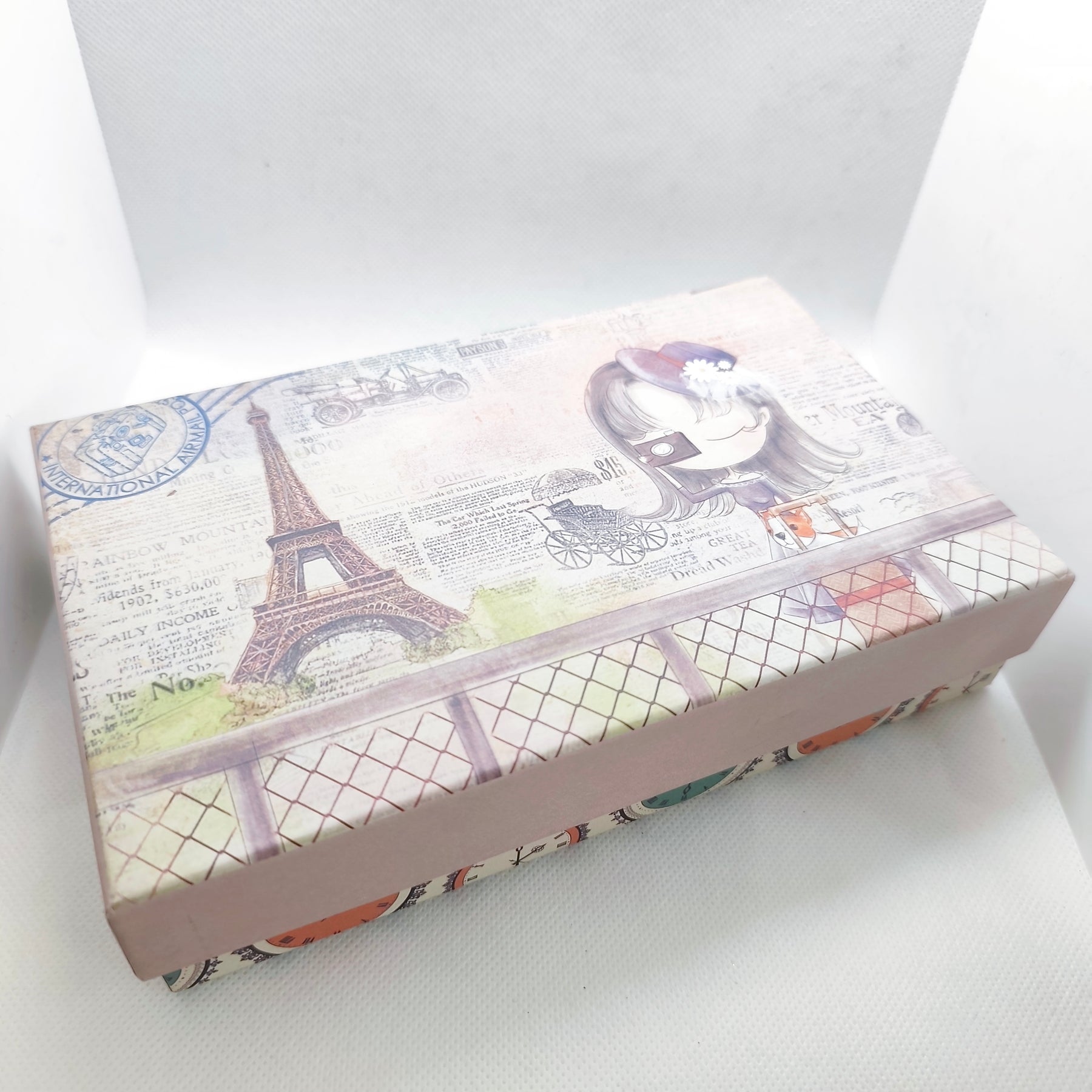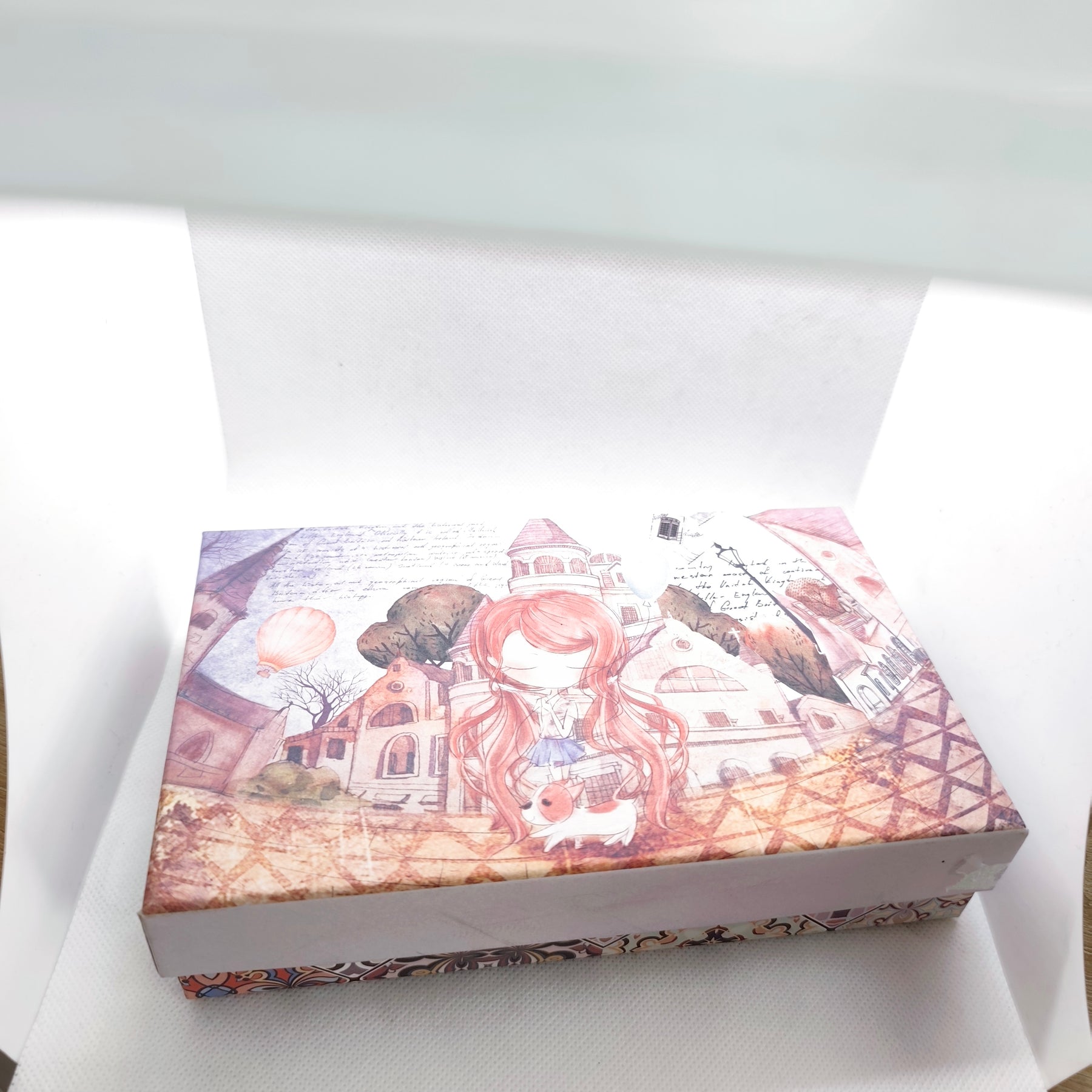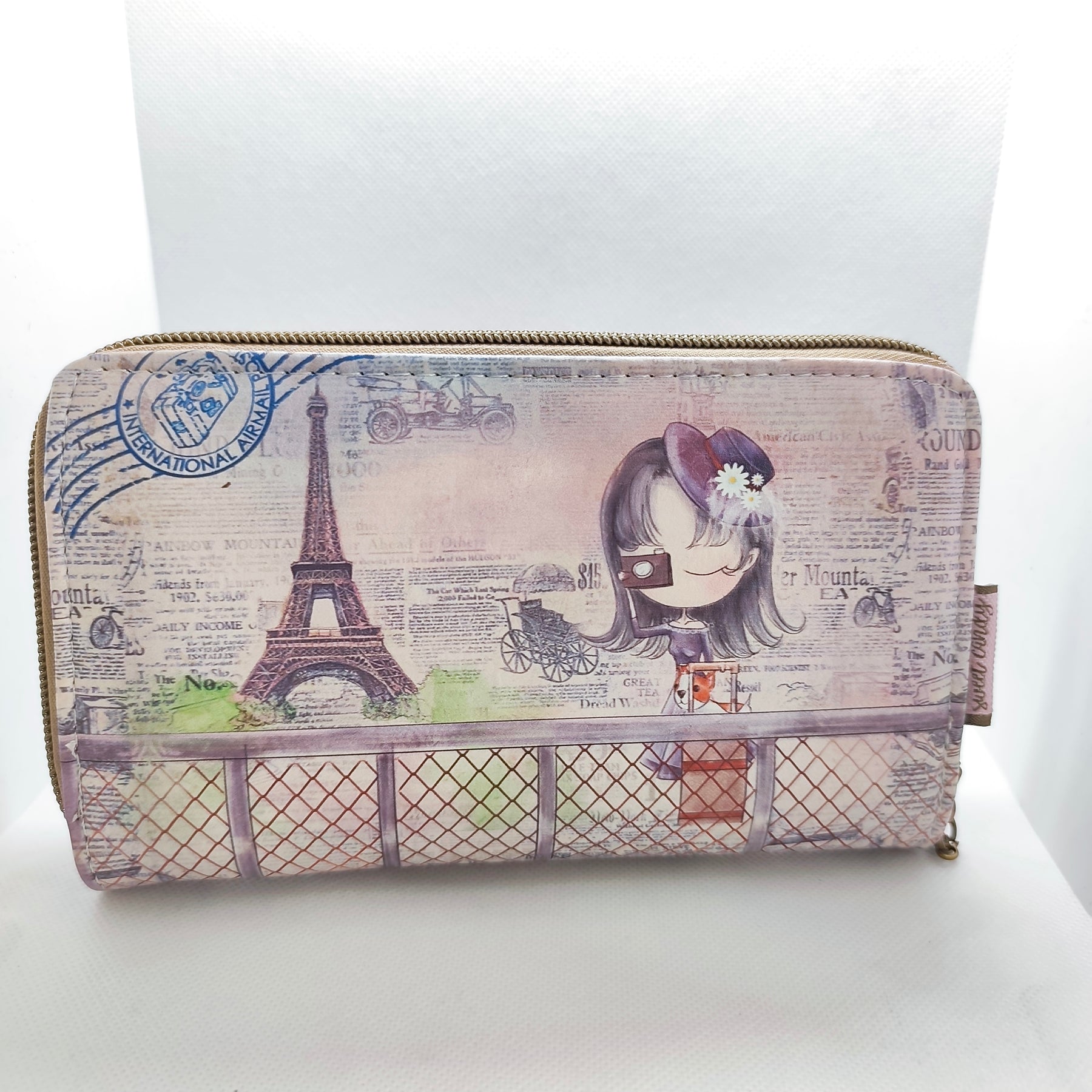 Illustrated wallet featuring, a cartoon girl, and travel-themed elements like postcards, maps, and stamps.