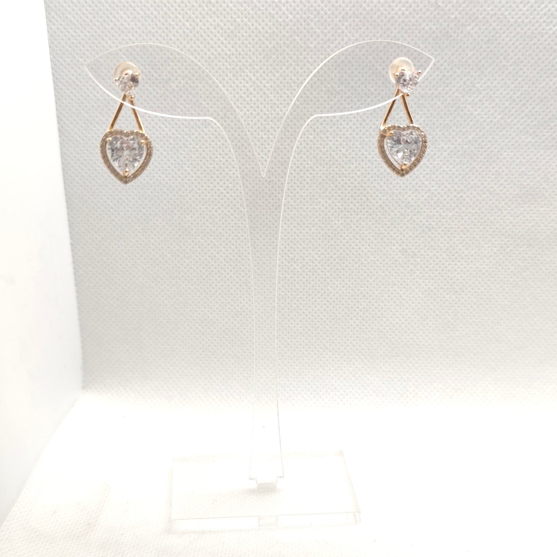 These earrings are delicate and elegant, featuring a heart-shaped gemstone as the main focal point. The gemstones are set within a gold-colored frame, hanging from a small, round stud that appears to be adorned with tiny crystals or diamonds. The overall design combines classic romance with a touch of sparkle, making them suitable for special occasions or everyday wear.