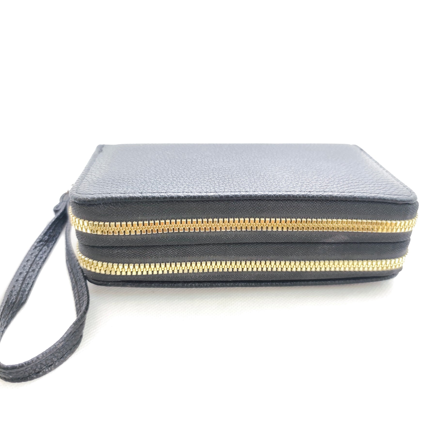 Elegant Textured black faux leather Wallet with Double gold Zipper for two separate compartments, matching wrist strap.