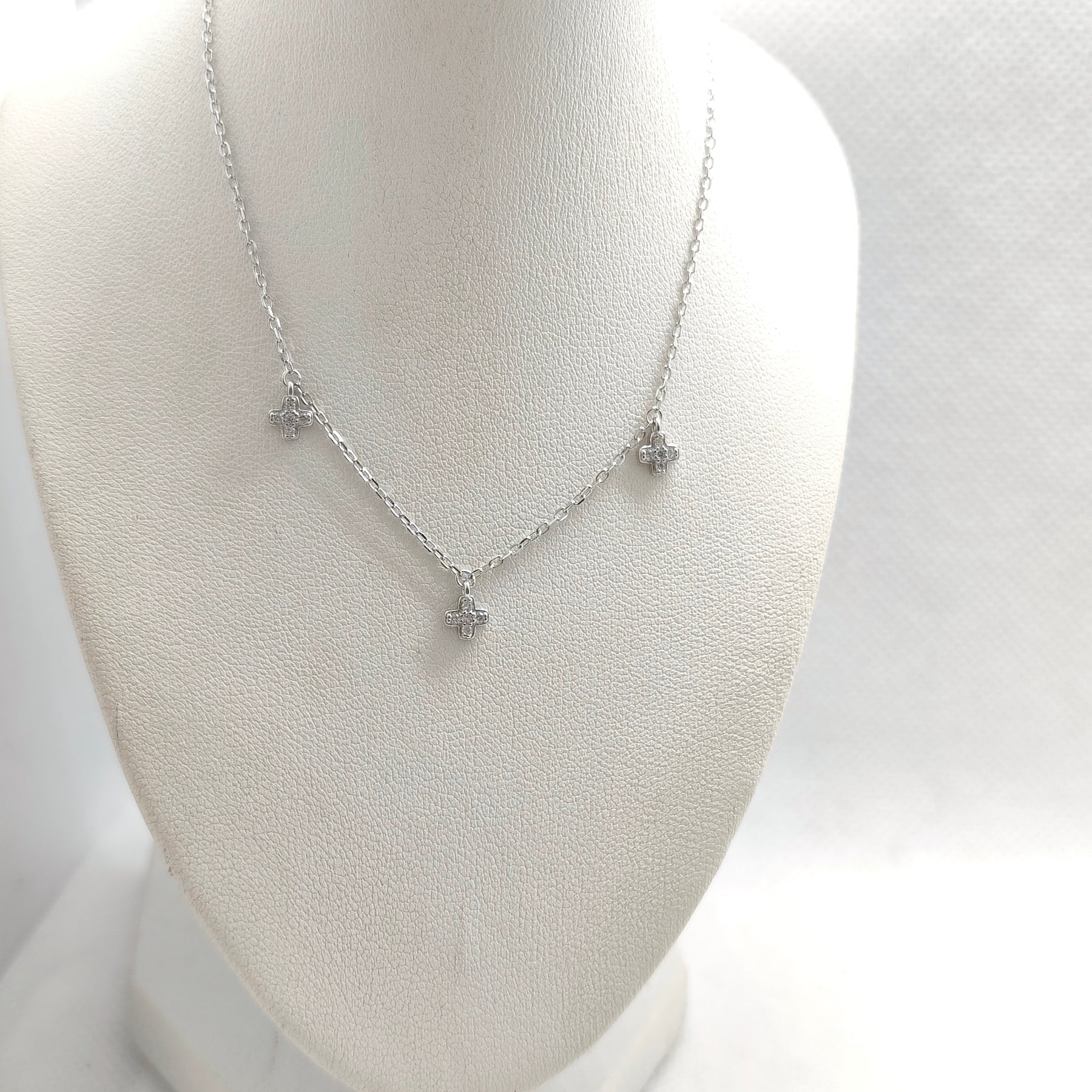 This elegant silver necklace features a delicate chain adorned with small, sparkling cross charms, each embellished with tiny gemstones. The design is minimalist yet sophisticated, perfect for adding a touch of subtle elegance to any outfit.