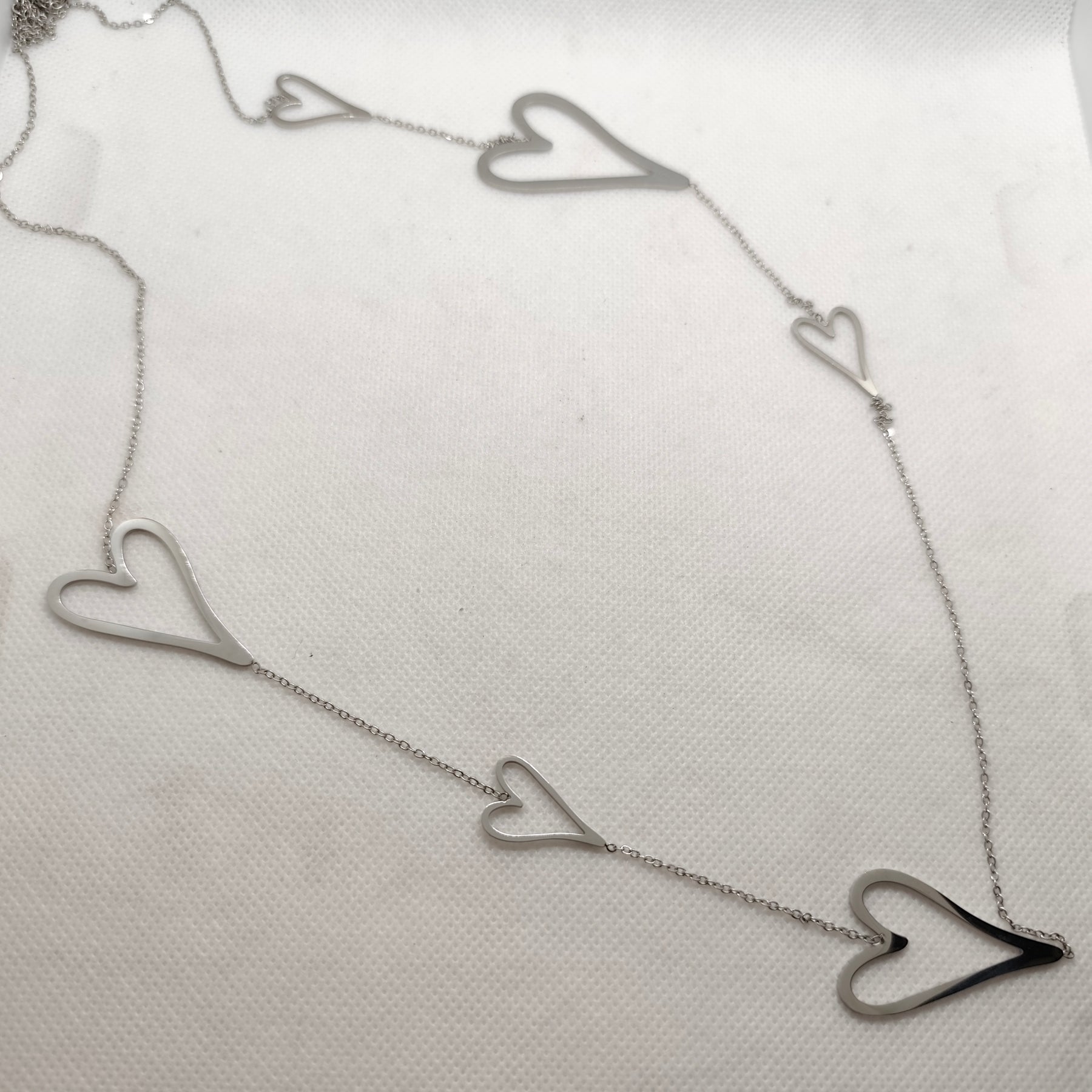 This delicate necklace features a series of open-heart shapes evenly spaced along a fine chain. The hearts are minimalist and modern, with smooth, sleek lines that create a subtle yet charming design. The necklace has a light, elegant appearance, perfect for everyday wear or as a meaningful gift.