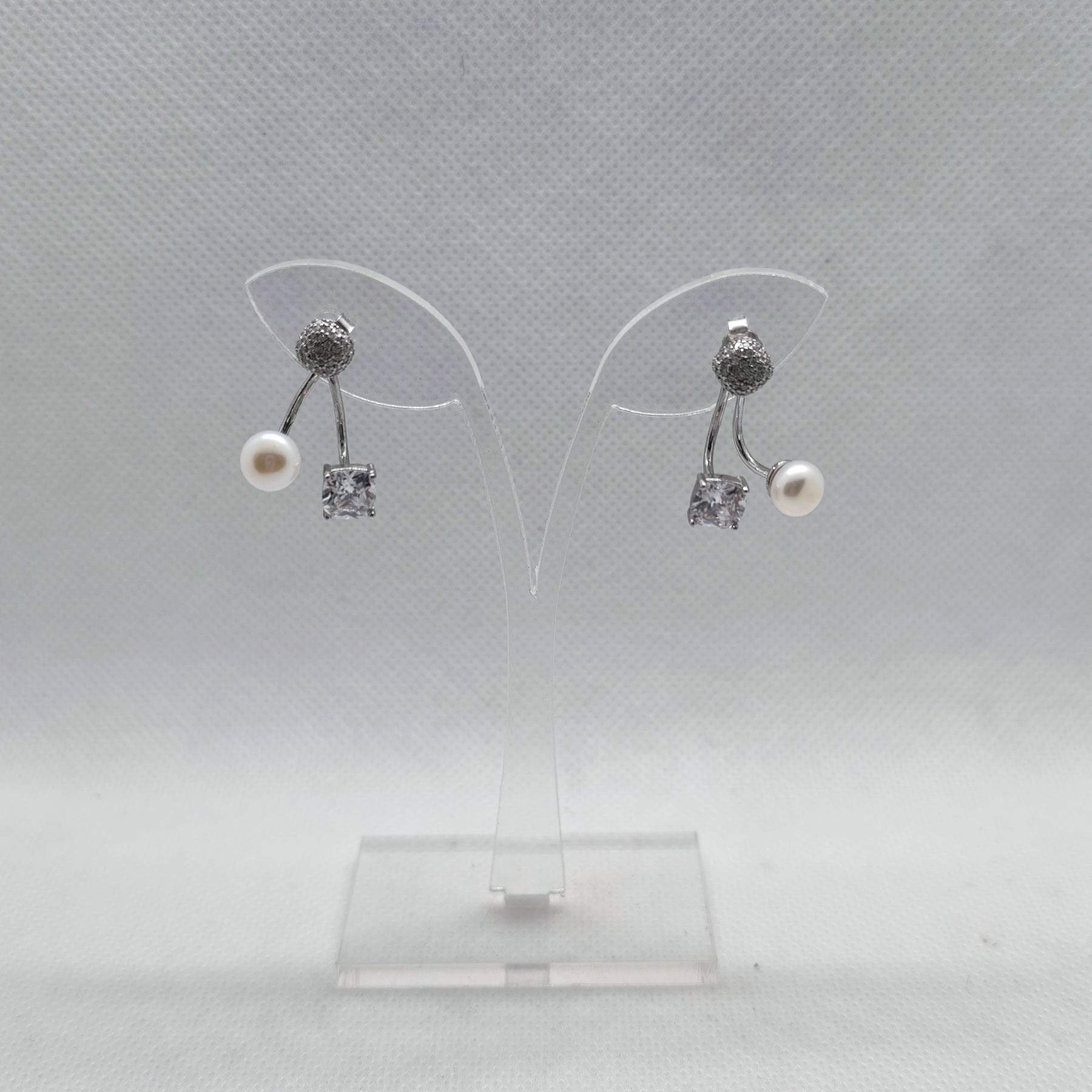 These elegant earrings feature a sophisticated design with a combination of classic and modern elements. Each earring has a sparkling round stud, encrusted with tiny glittering stones, which sits at the earlobe. Dangling from the stud is a delicate curved silver bar that supports two decorative charms: a lustrous white pearl and a shimmering square-cut clear gemstone. The combination of pearls, sparkling stones, and sleek silver creates a timeless yet contemporary look, perfect for both formal occasions and stylish everyday wear.