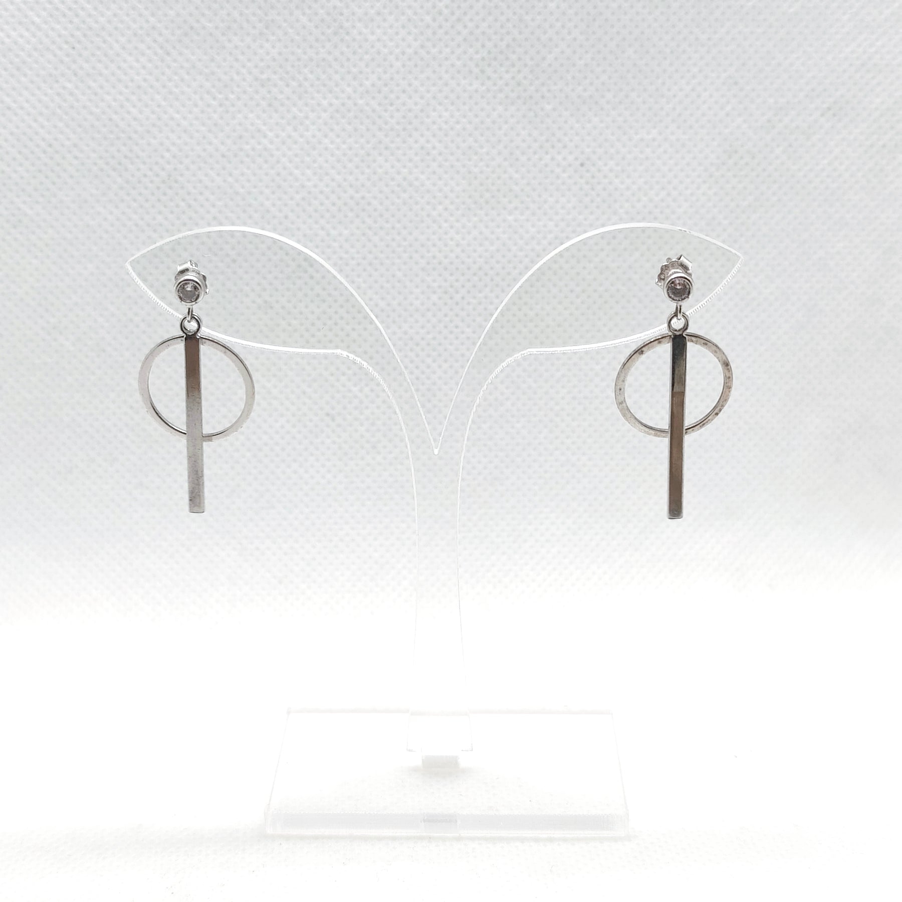 These contemporary earrings feature a sleek, minimalist design crafted from polished metal. Each earring showcases a small, round stud at the top, connected to a geometric arrangement of a delicate circle and a slender vertical bar. The combination of clean lines and simple shapes creates a modern, sophisticated look perfect for everyday wear or a stylish accent for special occasions.