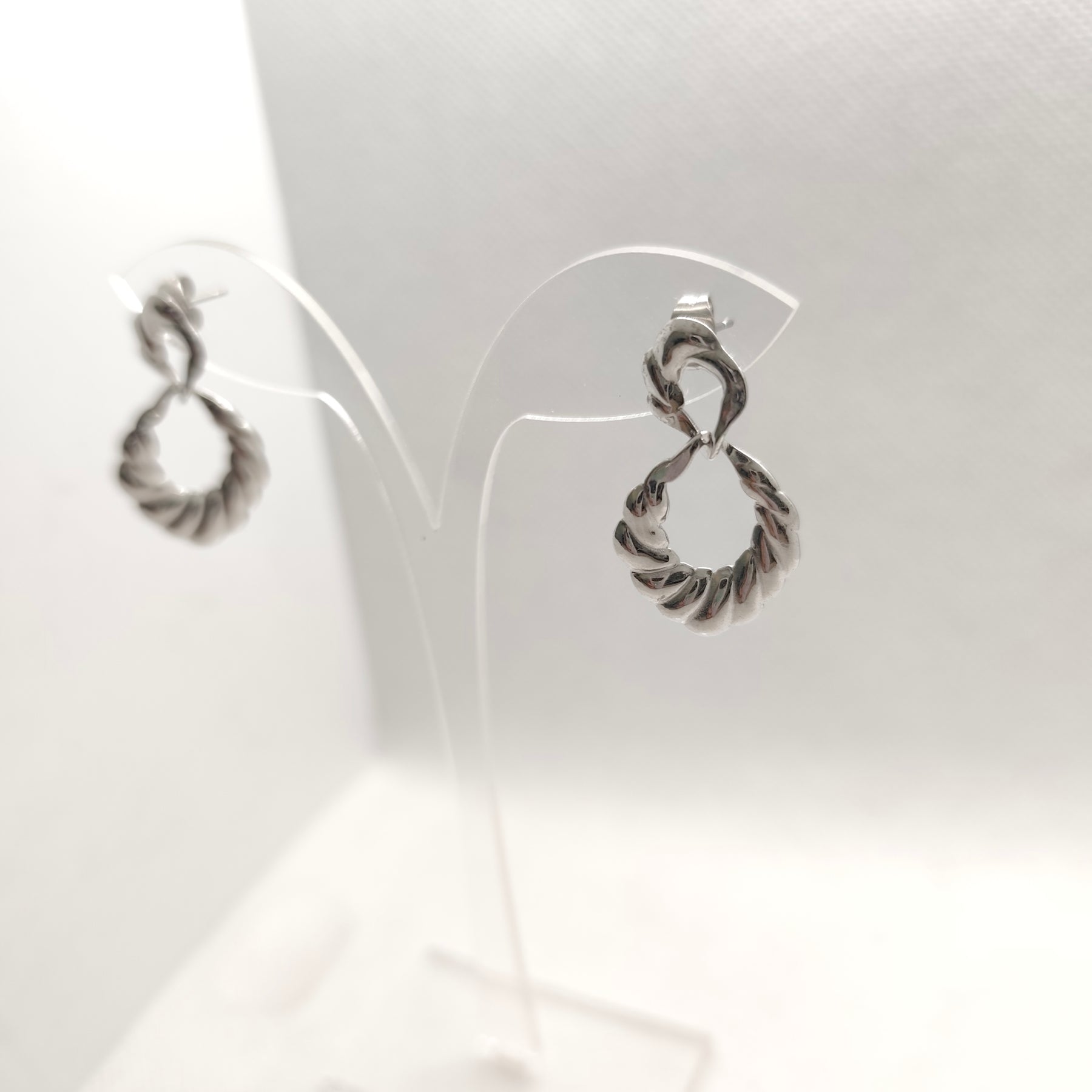 These earrings feature a twisted, hoop design with a polished silver finish. The hoops are slightly textured, giving them a modern yet elegant look. They are small to medium in size, making them versatile for both casual and formal wear. The earrings are secured with a latch-back closure for easy and secure wear.