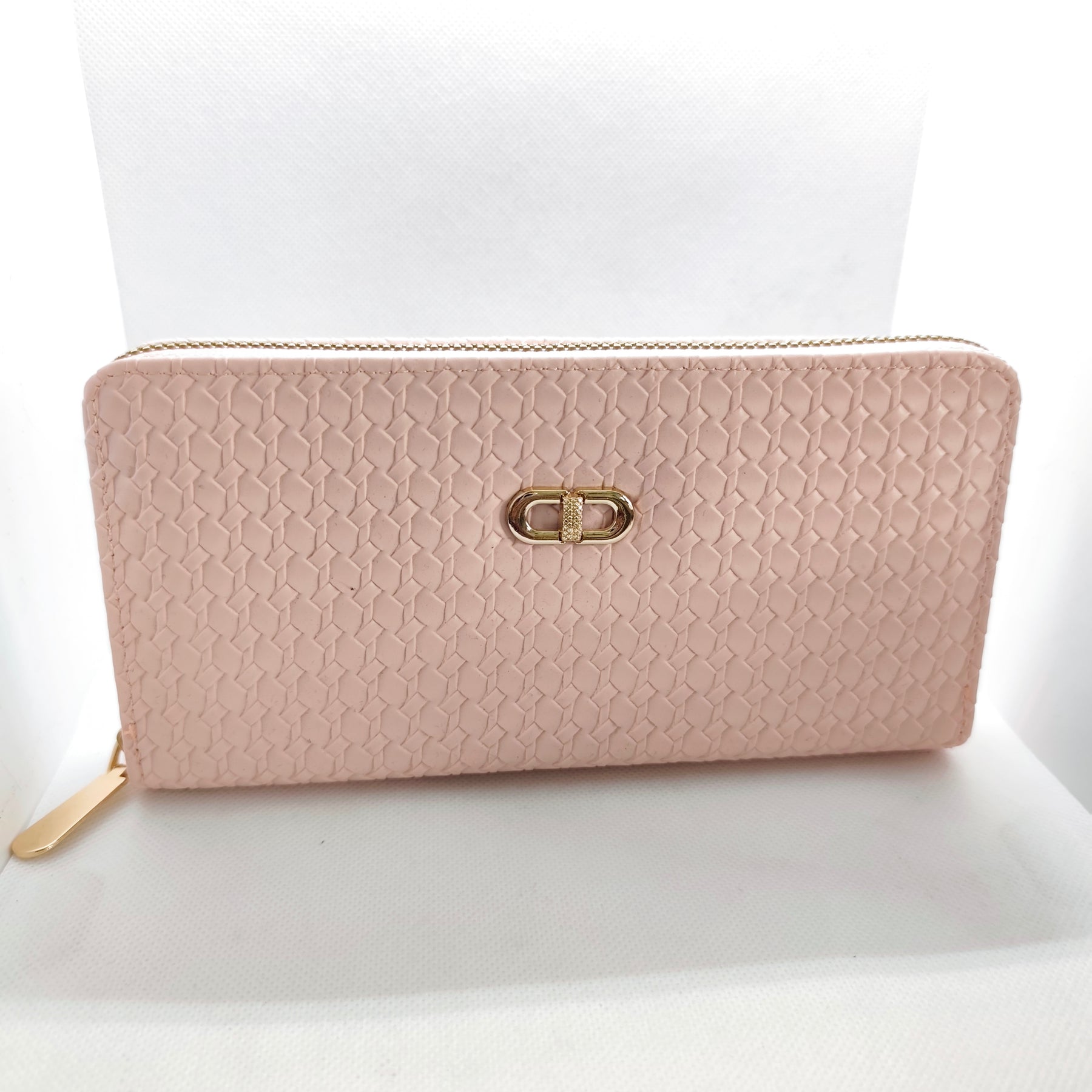 Pastel pink zip-around wallet featuring an intricate woven pattern and a gold decorative clasp emblem. Inside, it includes a central zip pocket, spacious card slots, and divider compartments, all designed for chic and organized storage.