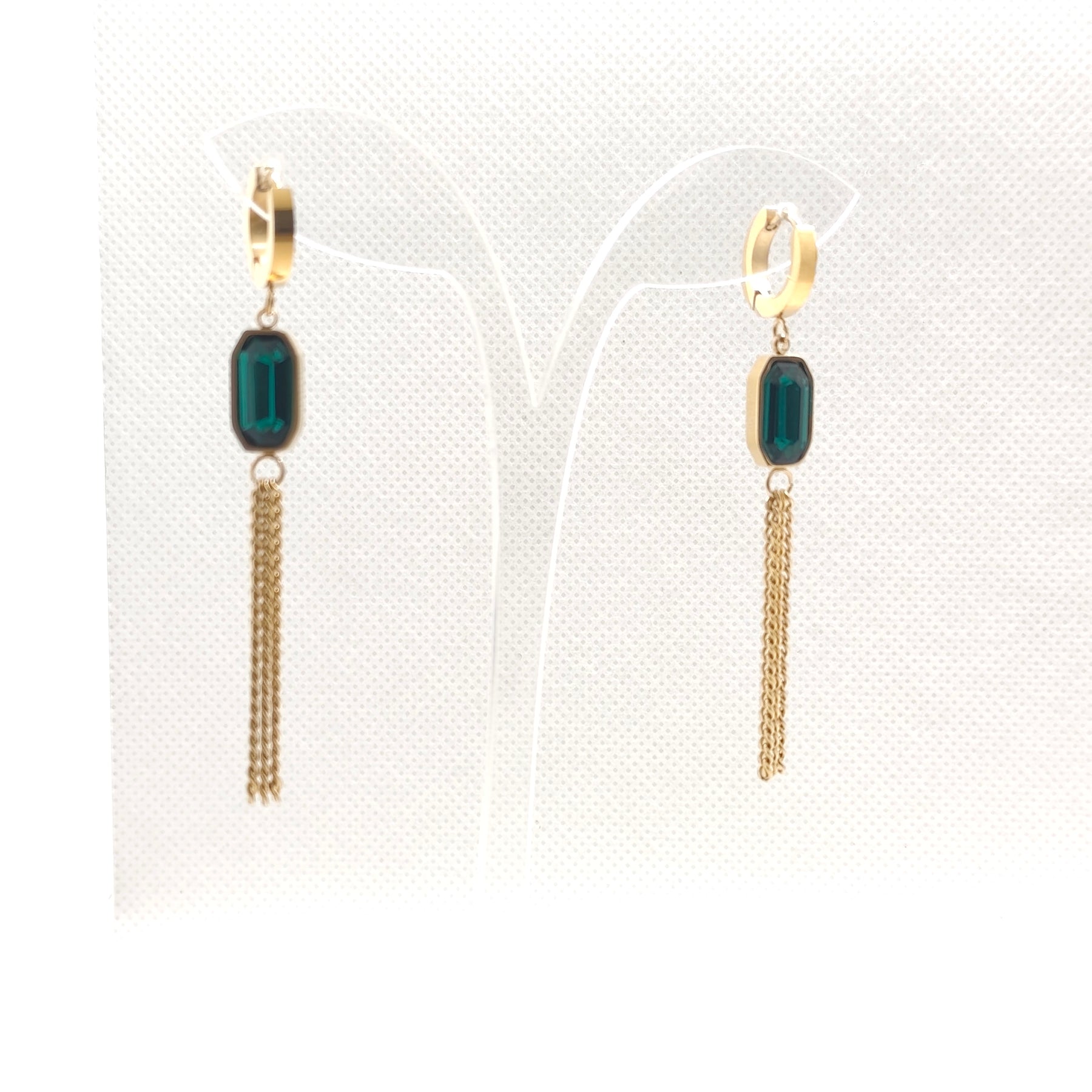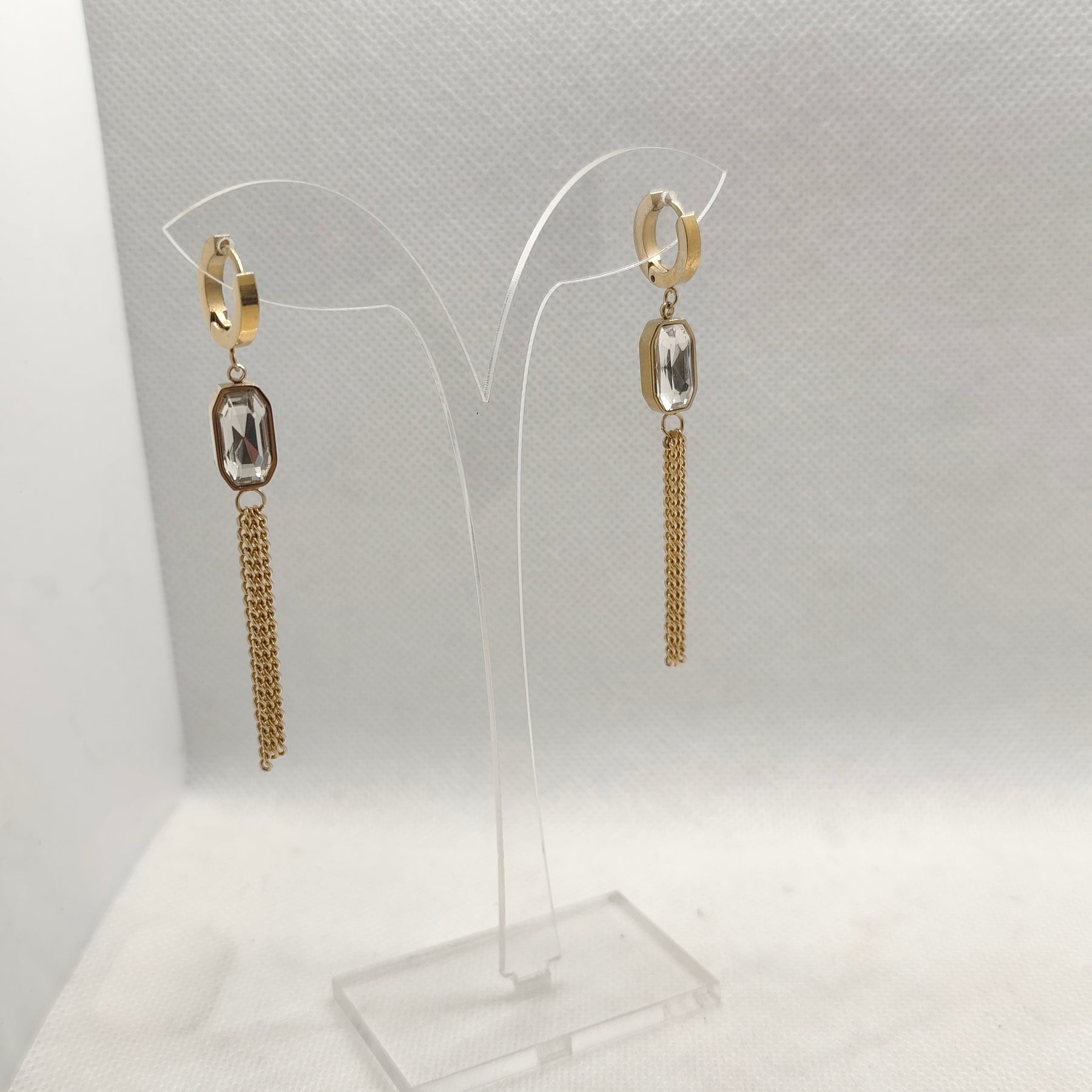 These earrings feature a sophisticated and contemporary design. They consist of a small, polished gold hoop at the top, from which hangs a rectangular, faceted clear stone set in a gold bezel. Below the stone, a delicate gold chain tassel adds movement and elegance to the piece. The combination of the shiny gold, the sparkling clear stone, and the flowing chains creates a chic and versatile accessory suitable for various occasions.
