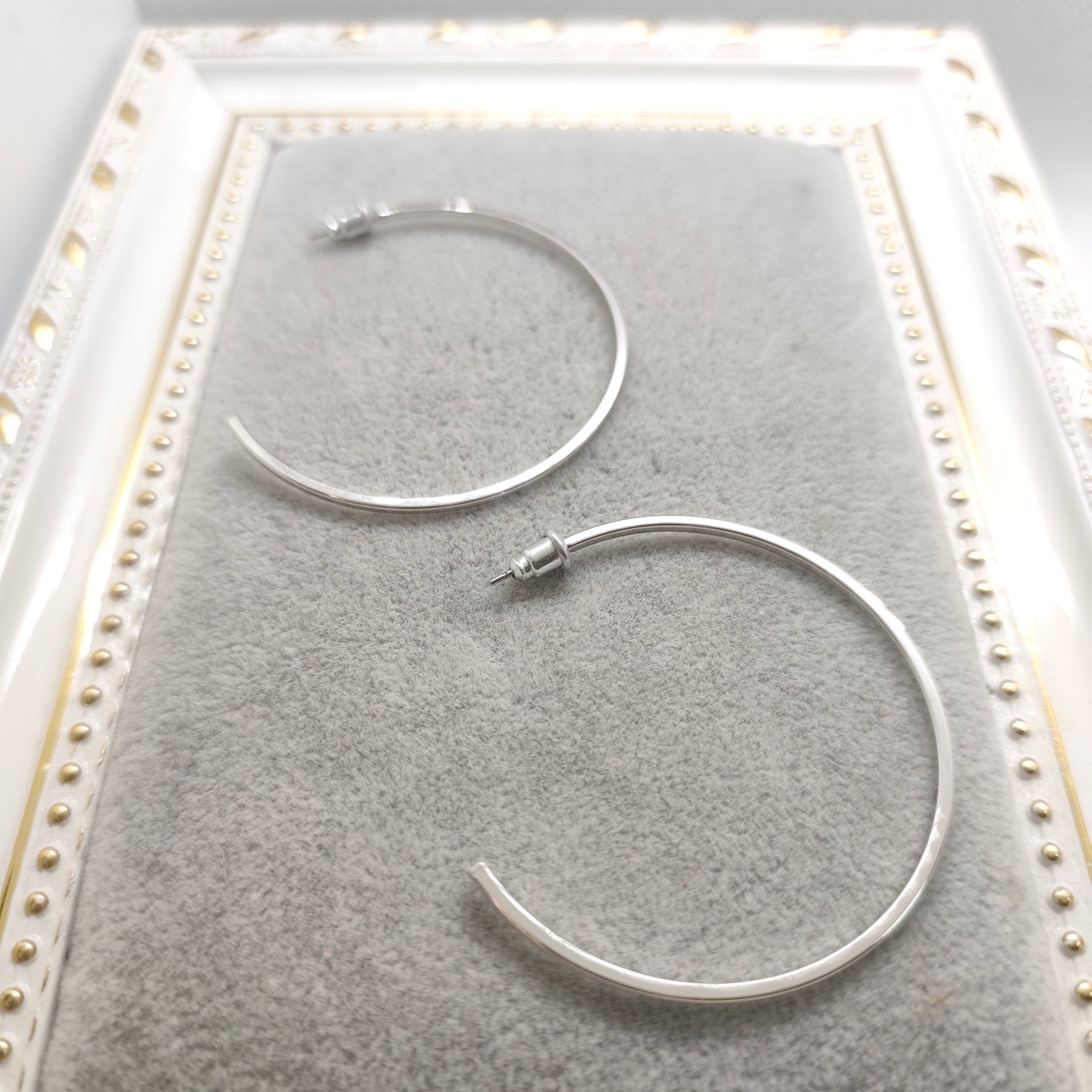 These are sleek, silver hoop earrings with a modern, minimalist design. The hoops are thin, elongated, and oval-shaped, giving them an elegant and contemporary look. They are simple yet stylish, perfect for everyday wear or adding a touch of sophistication to any outfit.