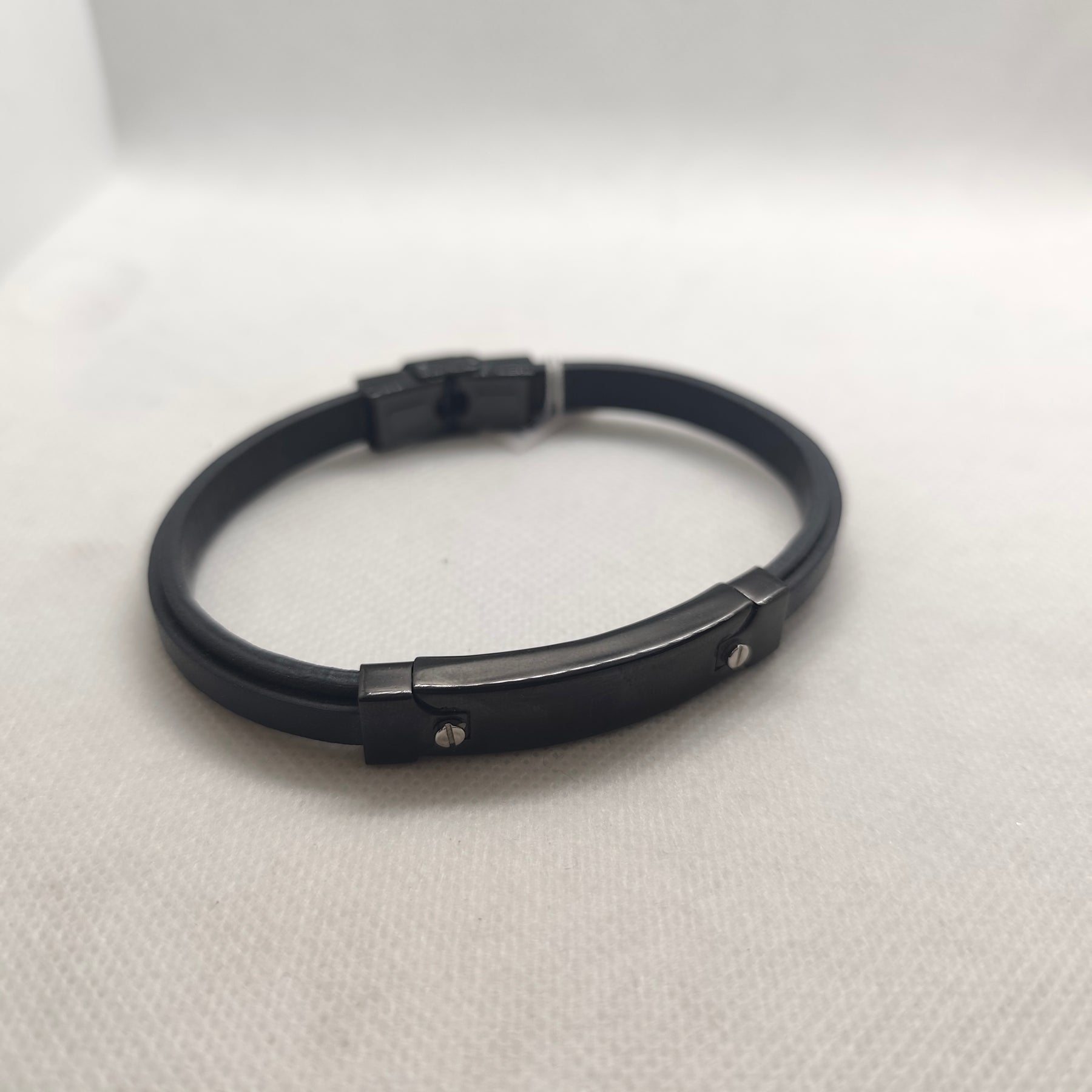 A contemporary men's bracelet combining black leather with metallic accents, offering a minimalist and masculine aesthetic. Its clean lines and sturdy construction make it a versatile accessory that complements both casual and formal styles, embodying understated elegance and modern masculinity.